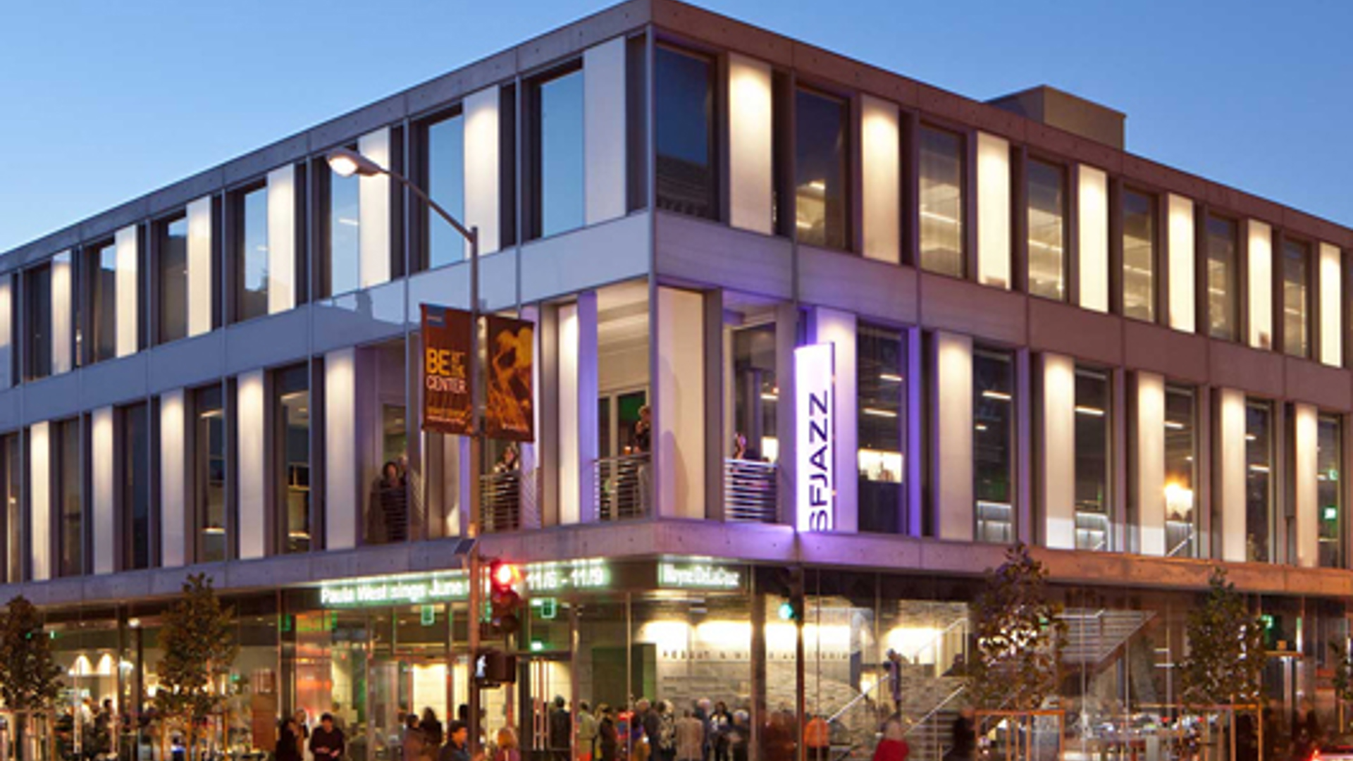 The sweeping main entrance of the SFJAZZ Center welcomes guests with floor-to-ceiling glass walls, in an open floor plan. The First Floor Lobby has direct access to B-Side Restaurant, Miner Auditorium, and the Joe Henderson Lab.